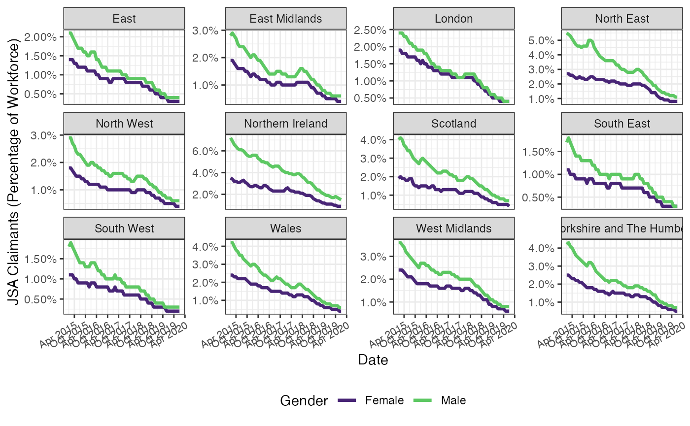 jsa <- jsa %>% mutate(date = as.Date(paste0(date, "-01")), obs_value = obs_value/100) theme_set(theme_bw()) p_jsa <- ggplot(jsa, aes(x = date, y = obs_value, colour = sex_name)) + geom_line(size = 1.15) + scale_colour_viridis_d(end = 0.75, begin = 0.1, name = "Gender") + scale_x_date(breaks = "6 months", date_labels = "%b %Y") + scale_y_continuous(labels = scales::percent) + theme(axis.text.x = element_text(angle = 30, hjust = 1, size = 8), legend.position = "bottom") + labs(x = "Date", y= "JSA Claimants (Percentage of Workforce)") + facet_wrap(~geography_name, scales = "free_y") p_jsa