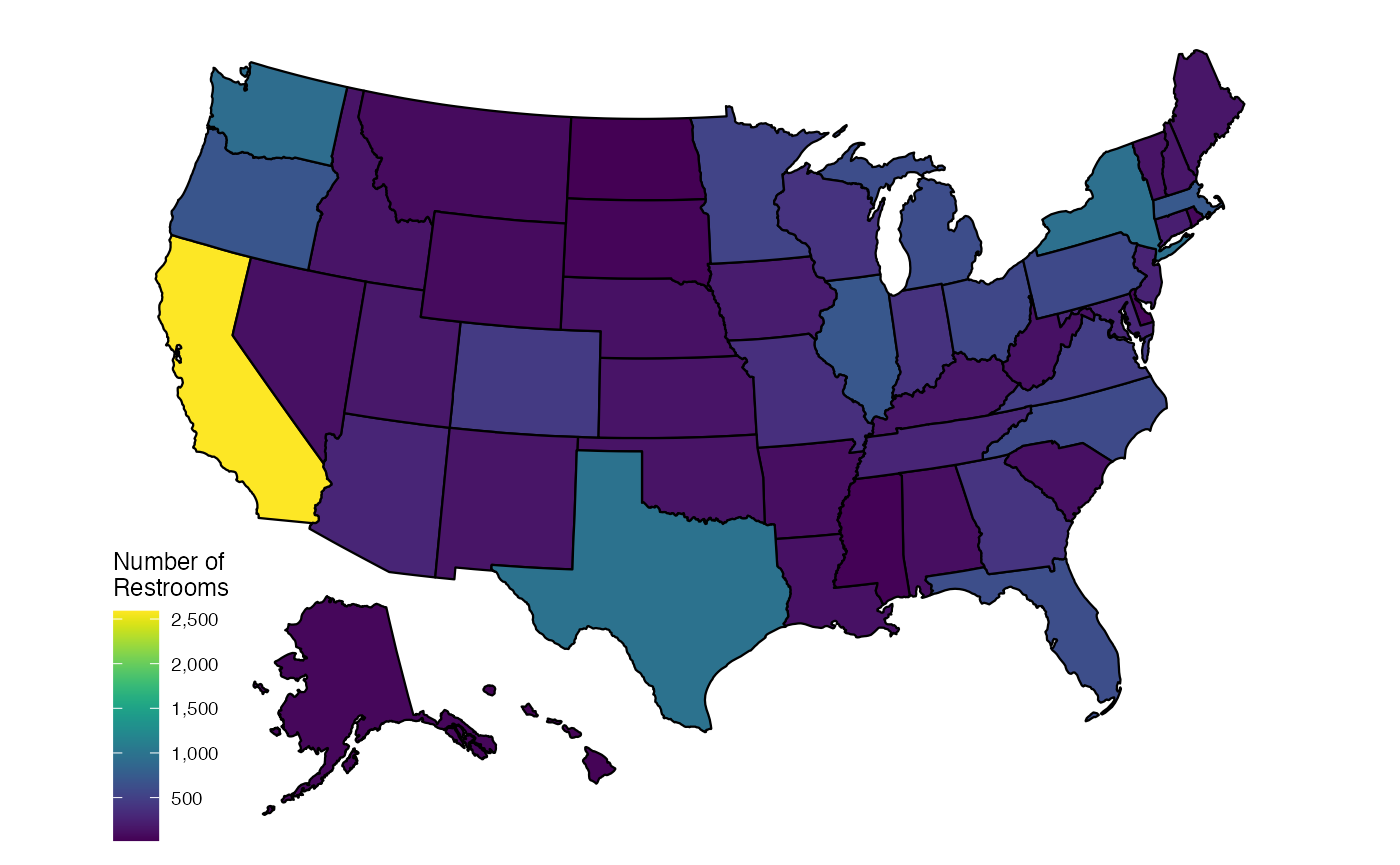 scale_fill_viridis(name = "Number of\nRestrooms", label = scales::comma) +